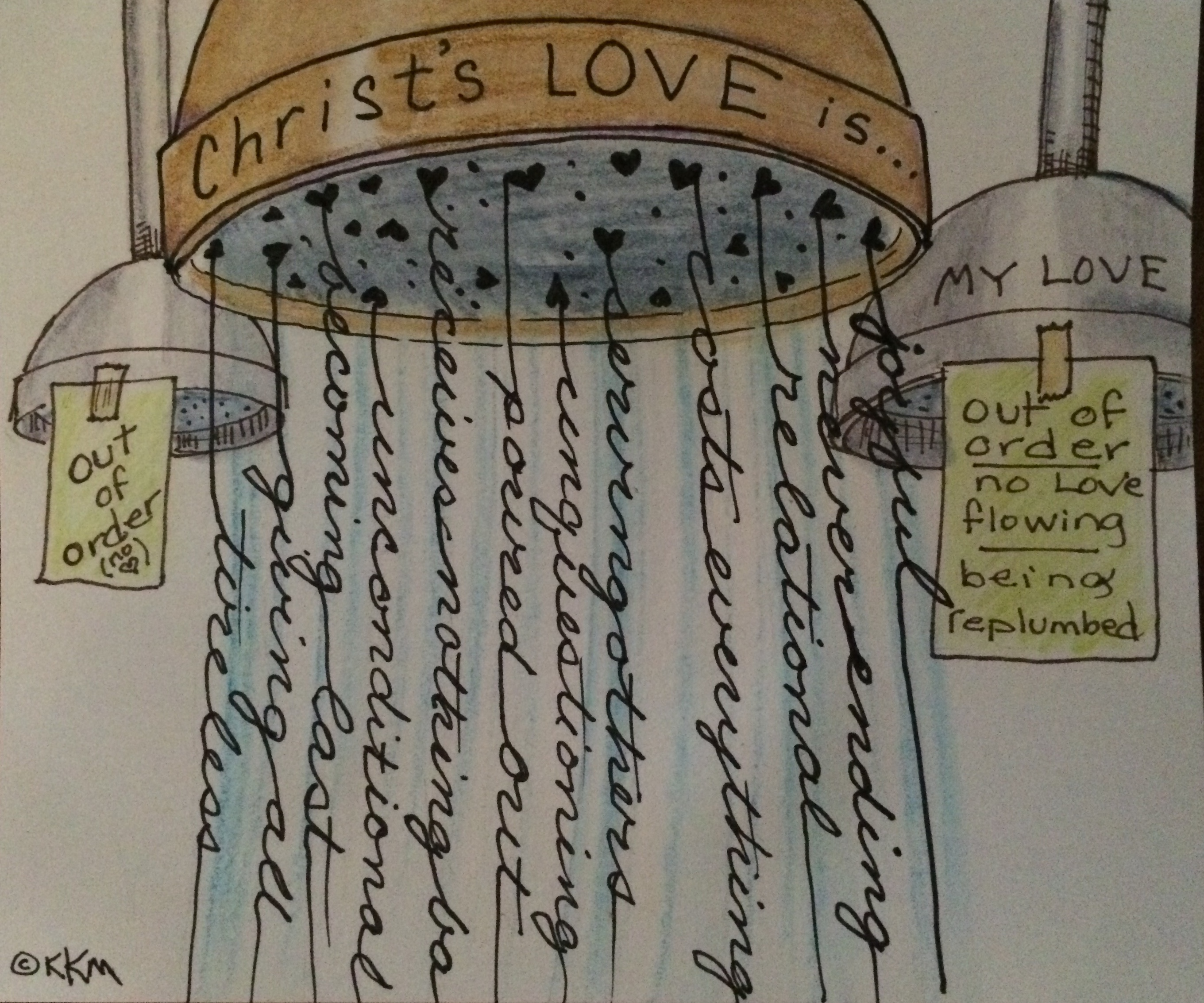 Slowly but surely God is replumbing me with ideas and visions of what His love is. For me, it is a paradigm shift, a proverbial Roto Rooter of unclogging my heart pipes from my agenda to produce–by the worlds standards–and preparing me to have a fluid, ‘it’s-okay-if-you-inturrupt-my-day, I’m here to serve’ attitude. I am so far from perfect love (Christ’s love), but hopefully, by His grace, His love will start flowing through me, showering everyone around me, cleansing hurt, fear, hunger and need–no matter my agenda at the beginning of the day.
