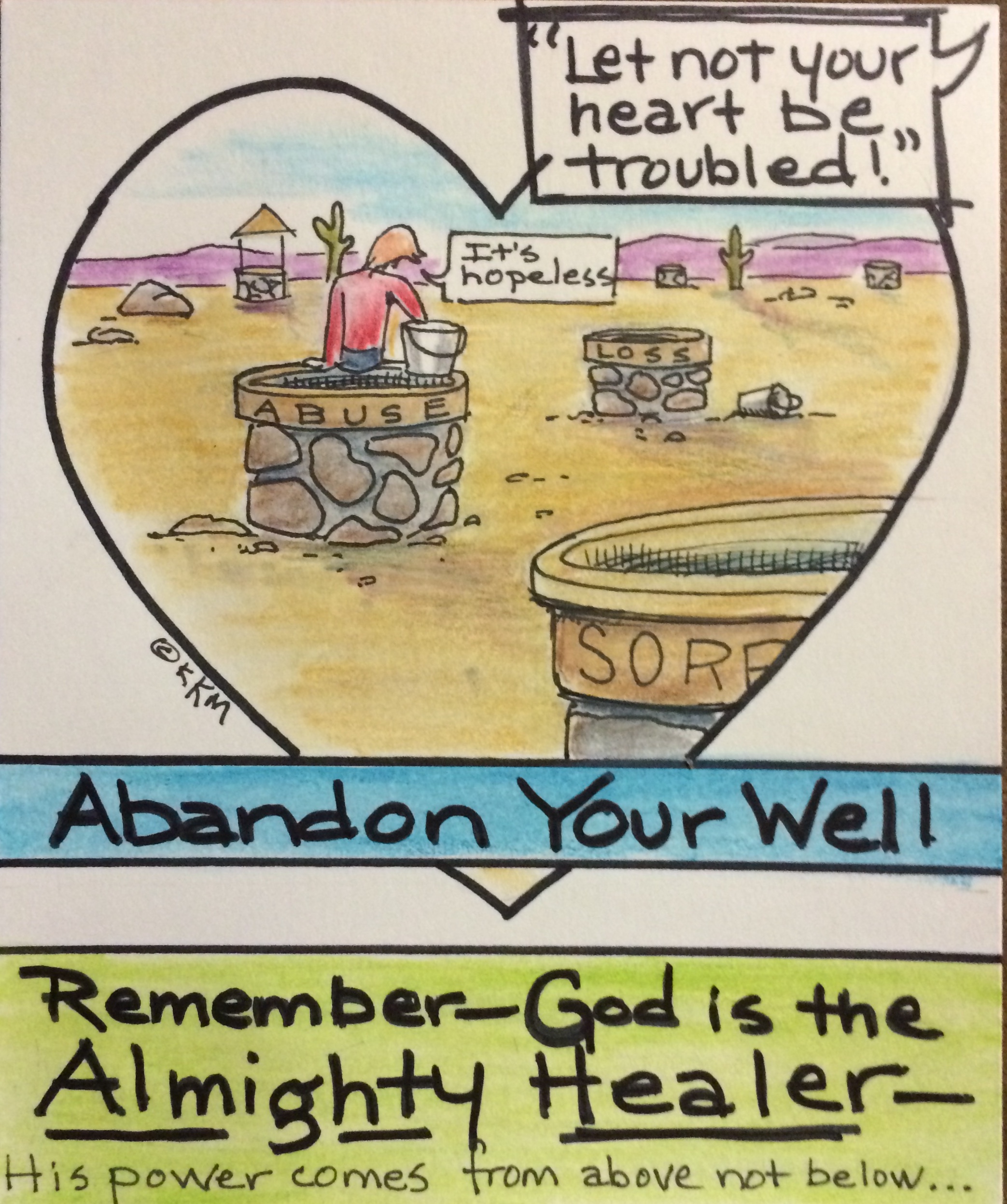 Be prepared–God does not leave one part of your ‘Well of Circumstances’ untouched. From my experience, He digs to the depths (this is often painful), fills to overflowing with peaceful, untroubled water then invites me to dance on the waters with Him. Now that ‘Well’ is a source of strength, encouragement and refreshment for others as well as myself. I visit only to be reminded of how utterly and completely powerful God is and that if He can heal this ‘Well’, he can heal anything that has been, is or ever will be. BE HEALED! Abandon yourself.