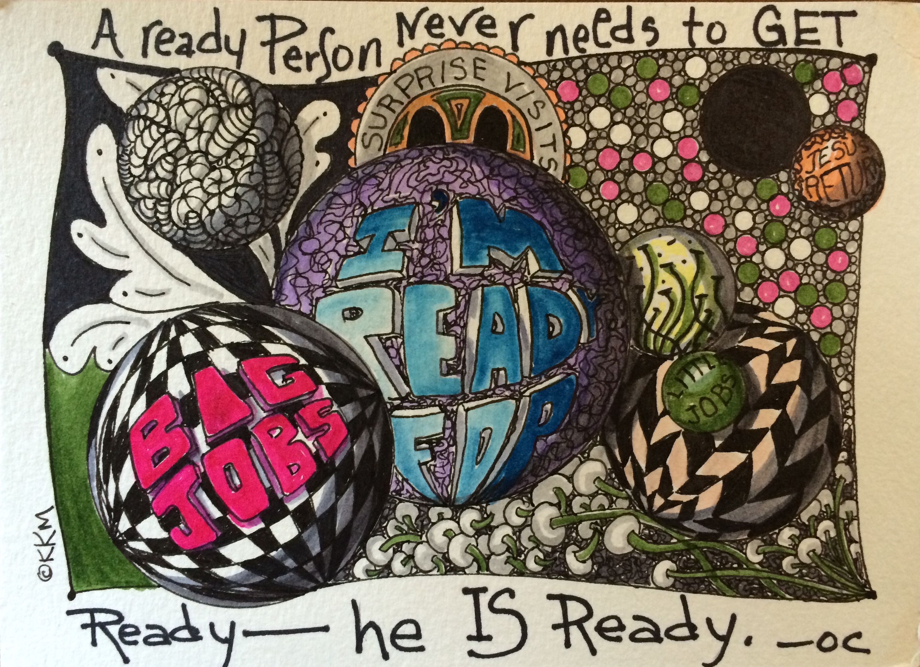 Those were words I grew up hearing. There was no amount of maintaining a relationship with God or ignoring of God that changed those words. It was always–“GET READY!” The problem with those words is this, they imply unreadiness, which implies laziness, sloughing off, not paying attention, not connected, not listening, disobedience, blah, blah, blah. The list goes on. I’ve found comfort in–“I’m ready.” There’s so much more reassurance in those words. They can be earnest, calm, anticipatory, or joyful. There is no anxiety involved just a looking forward to whatever–big or small jobs, light or heavy burdens, joy or sadness–God has for that day, that week, that year or for all eternity. I know that whatever comes my way, it is filtered through God and my continual connection with Him prepares me for anything–I’M READY!
