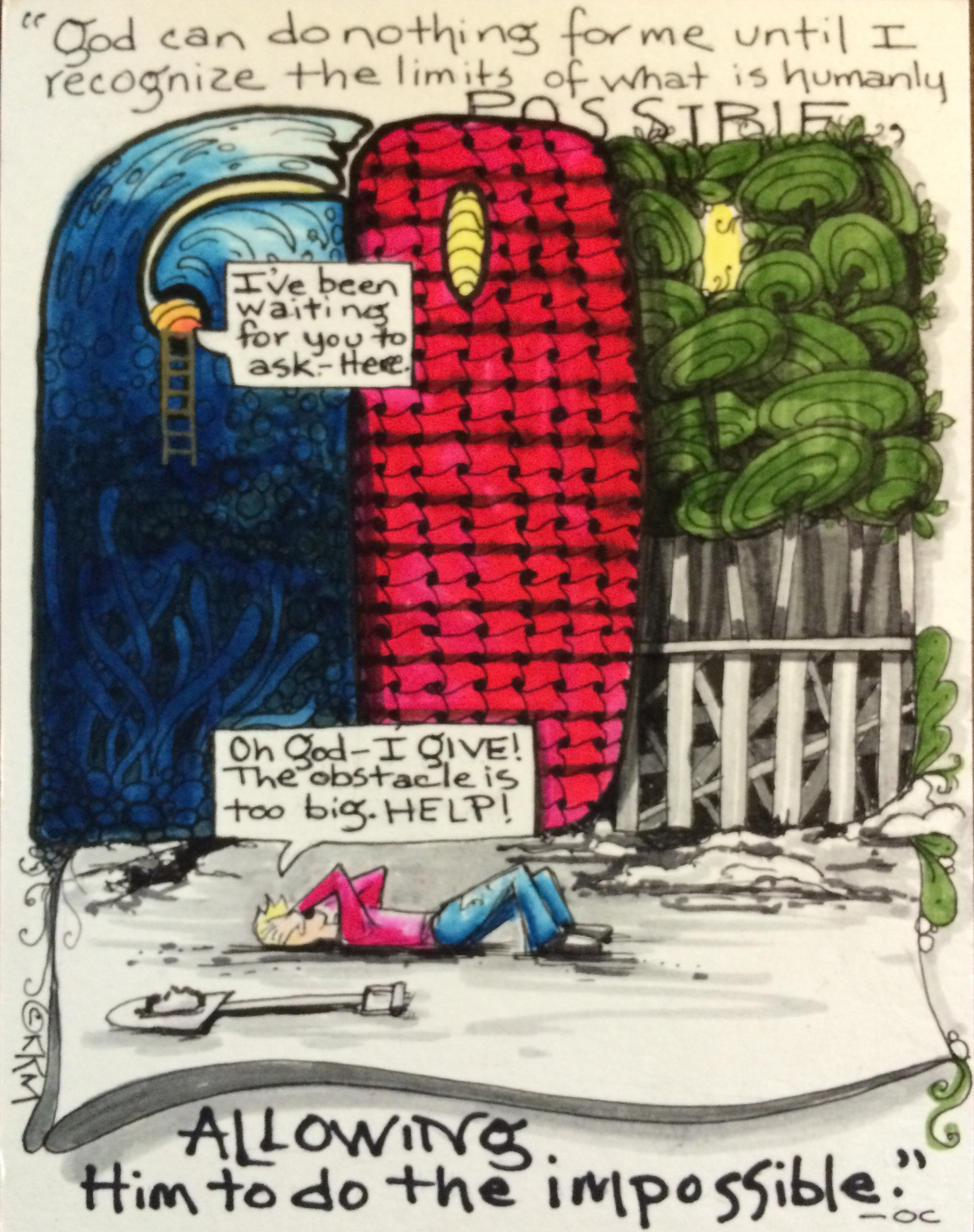 My experience with these kinds of obstacles have been overwhelming. First I’m overwhelmed with the obstacle itself and cannot see my way through–no matter what I try. Finally, I reach despair and fall to the ground crying, “UNCLE!” (That’s code for HELP GOD!!) After some serious confession and asking for help I’m overwhelmed again. This time–it’s an overwhelming peace, beyond any understanding, that floods through from head to toe and all I can do is lay on the floor absorbing it all in awe, relief and DELIGHT–wondering to myself, “What just happened?” In actuality, usually nothing has happened, YET (accept we’ve finally released control and given it to God). But somehow, I know that what was impossible just a little bit ago, is now possible and if anything, will turn out better than I’d ever planned.
