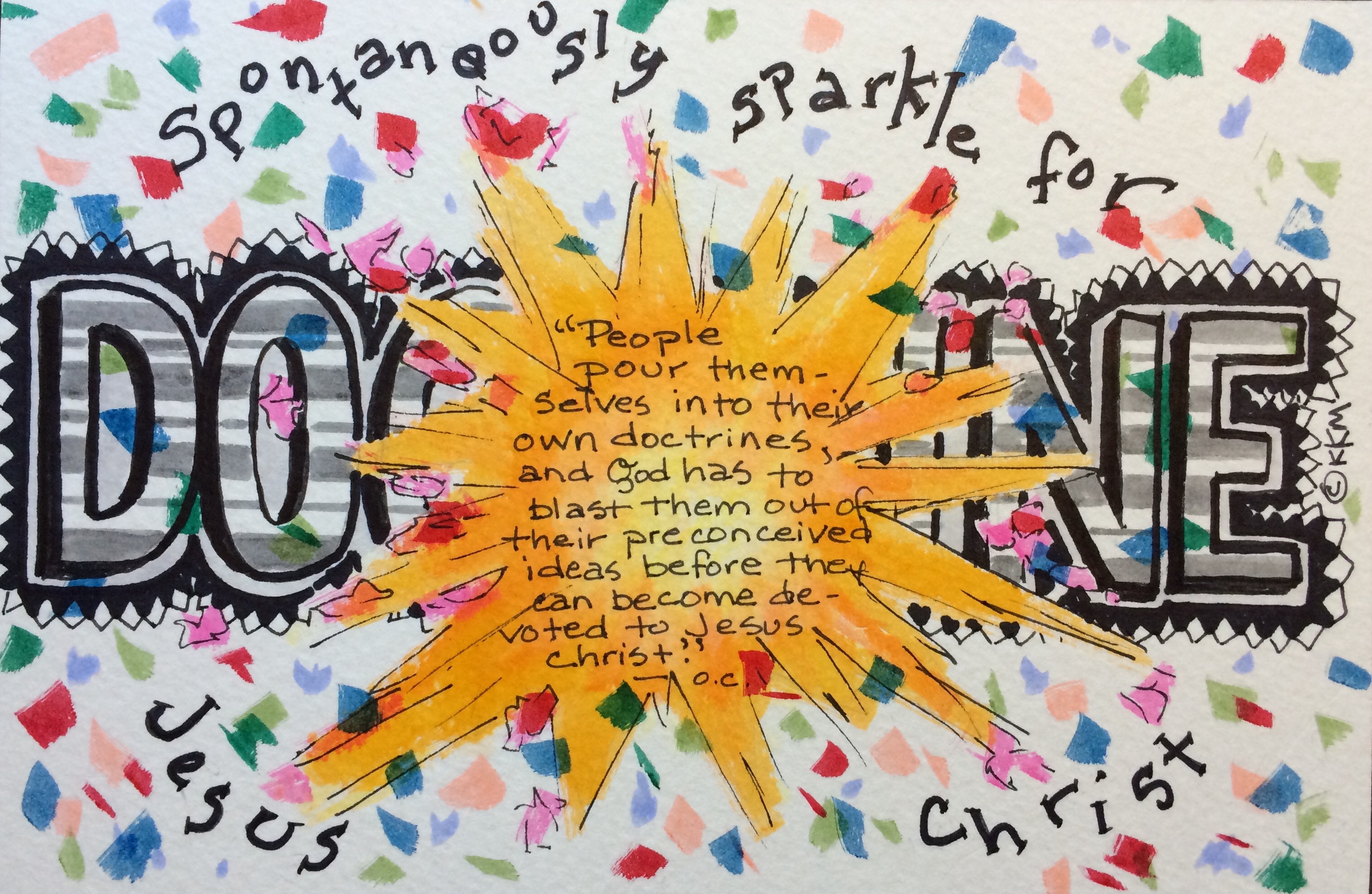 This is where my personal testimony comes in. Having come from a very doctrine driven, “We have the “truth” for present day”, here’s a list of do’s and don’ts, “You might go to hell if you do that!” church, I feel confident to speak to this and the pain of the B L A S T. I feared the blast and I stayed in my “truth” for as long as I could–there was structure and familiar comfort there. But the moment I chose Jesus Christ over my “truth” I was set free and my life has never been the same. It is a constant creative flow. I feared that I’d be blown by “every wind of doctrine” and would not know “truth”. The fascinating thing is, I’ve never felt so secure and held by anything, even though there is no hard, fast rule for how to live my life. I find that guilt, fear of the future, shame or judgment on others no longer exists in my life–why?–I think it’s because I’m willing now to let everyone be in their own place on their own journey with God and I’ve dropped the need to make things “right” in the world, at least in a doctrinal sense. Because the Holy Spirit is my only guide now, I am open to receive what He has to give me–namely, a love and devotion to Jesus Christ that doctrines keep you from–and then I’m free to sparkle, spontaneously!