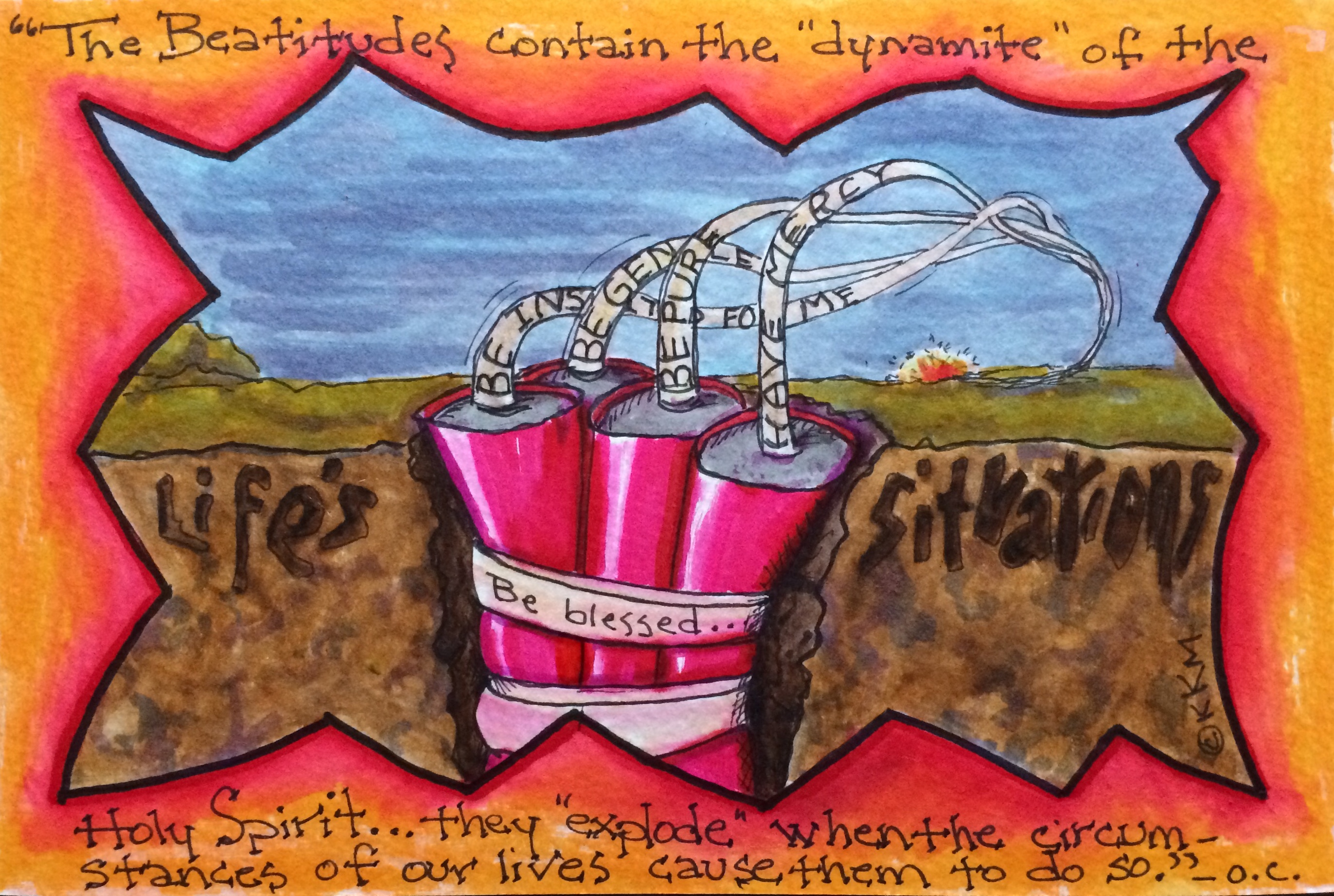 However, if we take them, the “blessed’s,” seriously, they WILL hurt, they WILL explode–why? Because they ask from us unnatural things and in order to obey them we have to look outside of ourselves. It is only through the power of the Holy Spirit and the love of Christ in us that causes us to be merciful or kind or loving or meek or, or, or . . . in the face of life situations where our human nature is kicking and screaming to have its way and begs for justice–“But I deserve better!”. After all, don’t we have rights? Shouldn’t we be treated fairly? The reality is, did Jesus have rights? Was he treated fairly? Did he tolerate abuse and rebuke and ridicule for us? And to think He had a choice in the matter and yet he still came down and did it for us. So, it’s our turn to return the love (unconditionally) in every life situation.