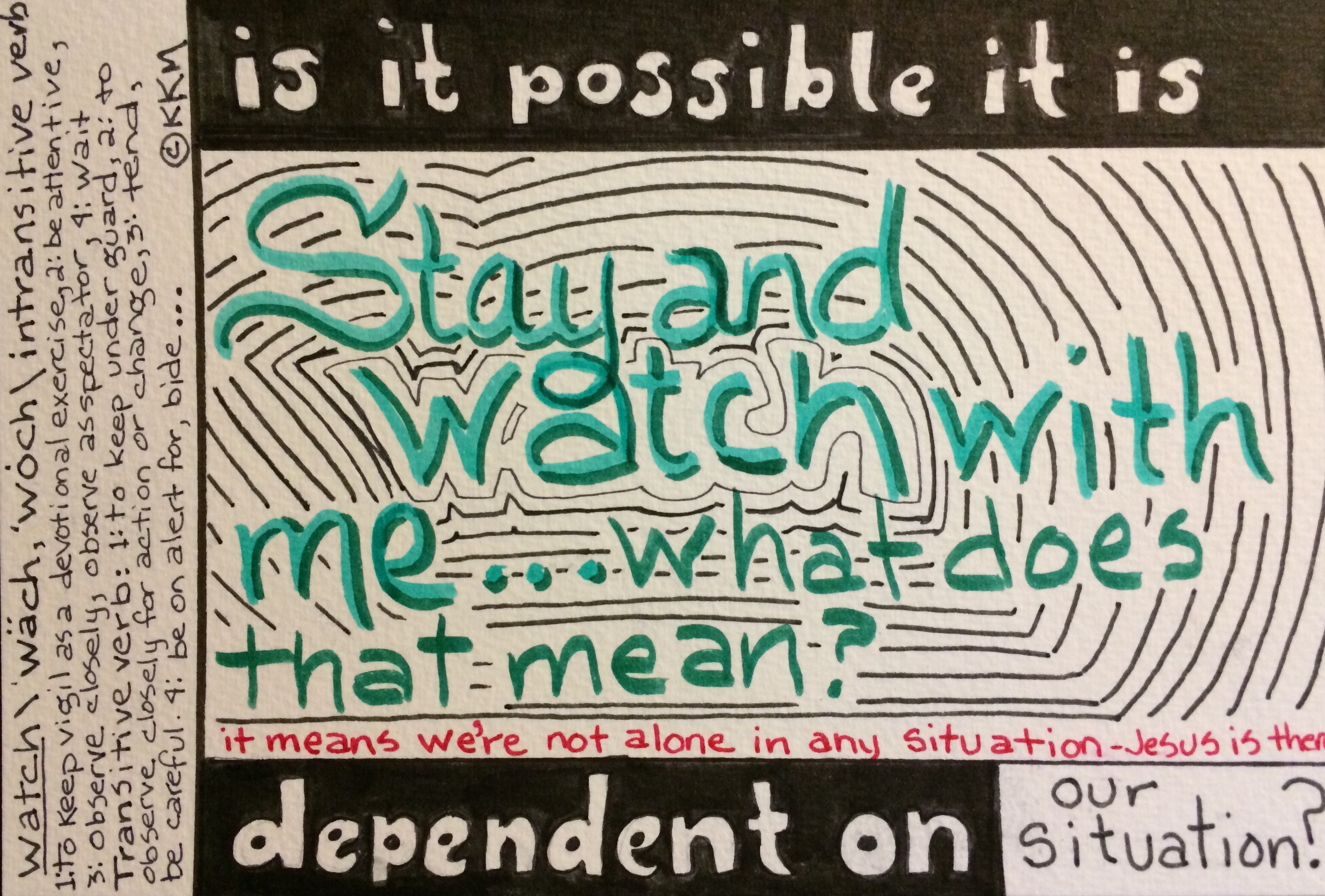 This is not a very well thought out, beautiful doodle. In fact, it pretty much reflects my insides right now as I “watch” for some situations to play out that to me are impossible. Honestly, my mind was a blank this morning as I read the devotional about watching “with” Jesus, instead of “for” Jesus like we do when we are new in our walk with Him. As I scribbled it dawned on me–what really matters to me at the moment is this–I’m not alone in the watching, Jesus is there. So, I’ll keep watching and waiting and continue to say, “If Jesus can calm the storm, He can calm me.”