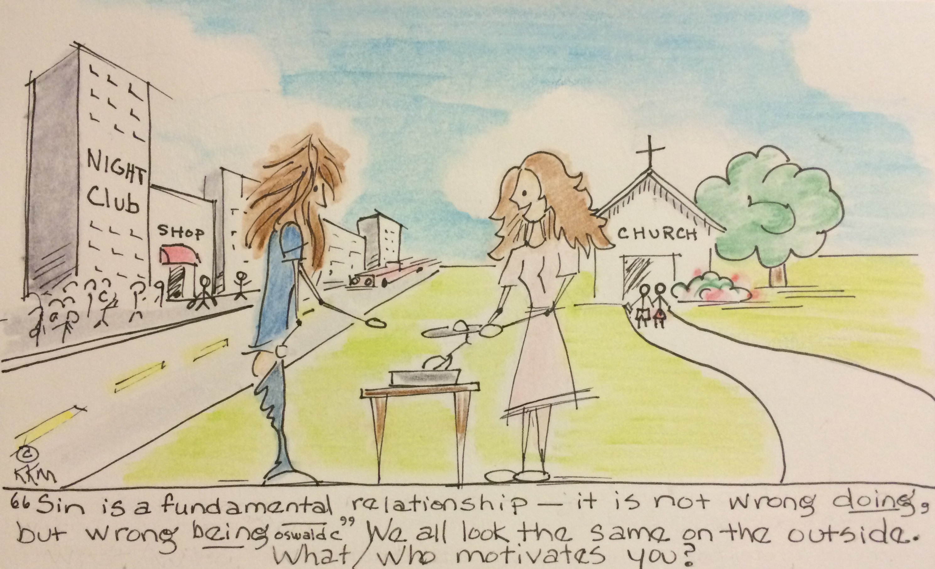 When you look at the doodle I did last year, representing the nature of sin, you can’t really tell who is the ‘good’ person or who is the ‘bad’ person.  The point is, it’s the motivating nature within us that makes the difference.  We all assume that a homeless person has fallen on bad luck because they are sinful or those in the ‘churchgoing’ group are being motivated by their goodness within.  Fact is–it doesn’t matter where or who you are or what you’ve done or are doing–if we have not addressed the fact of hereditary sin we’re all being motivated for the wrong reasons because our nature is sin/FULL.