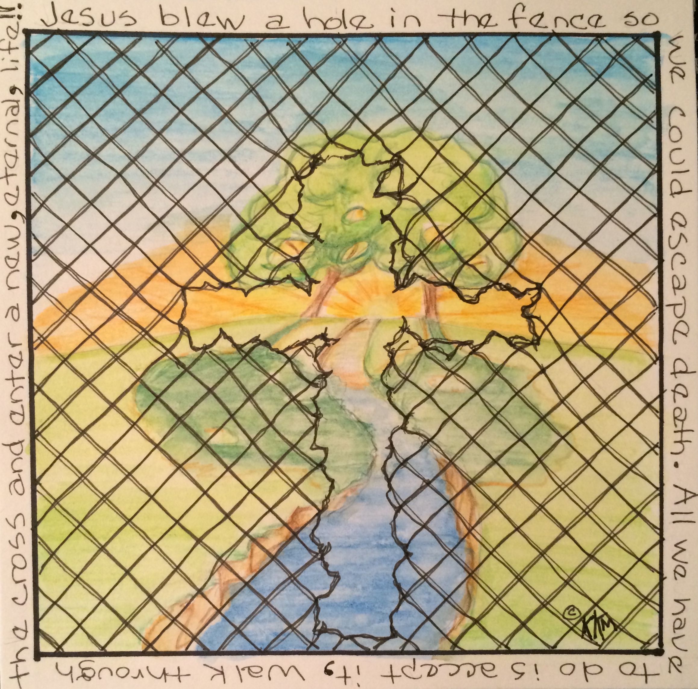 As I think about what I wrote and doodled in light of what I read this morning it reminds me that we have a life sentence on this earth–a huge fence between us and eternity. We can try to climb over it (work our way to eternity), get on the ground and try to crawl under with our humble repentance and penance but it’s not till we accept and enter through Christ’s work that we will ever have eternal life.