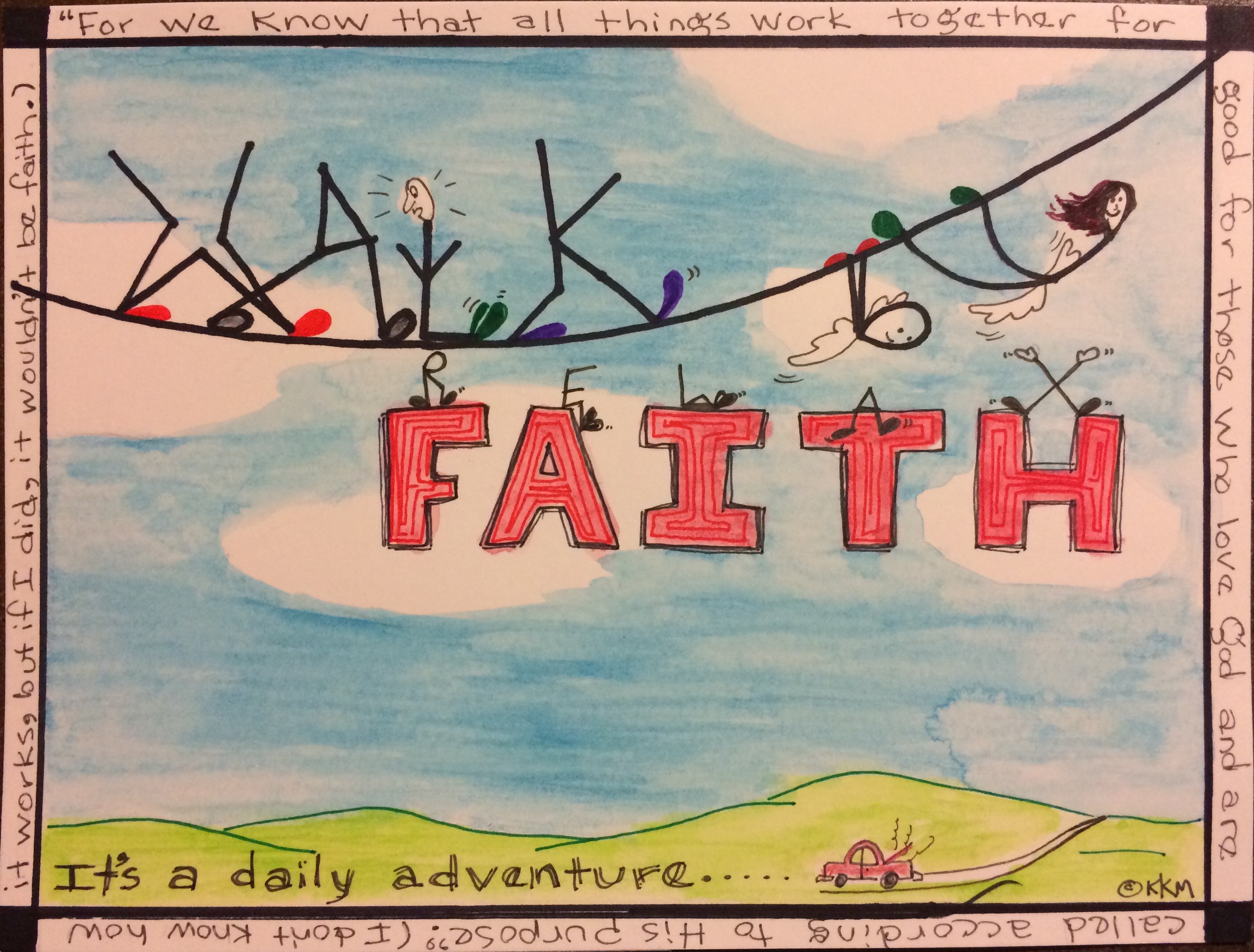 Life’s an adventure with God.  This is what I wrote on the back of my doodle last year–“Walking by faith is not for the faint-hearted, in fact it is more like being a “thrill seeker.”  You allow yourself to let go of control of your circumstances and somehow things turn out better than you ever planned for yourself.”