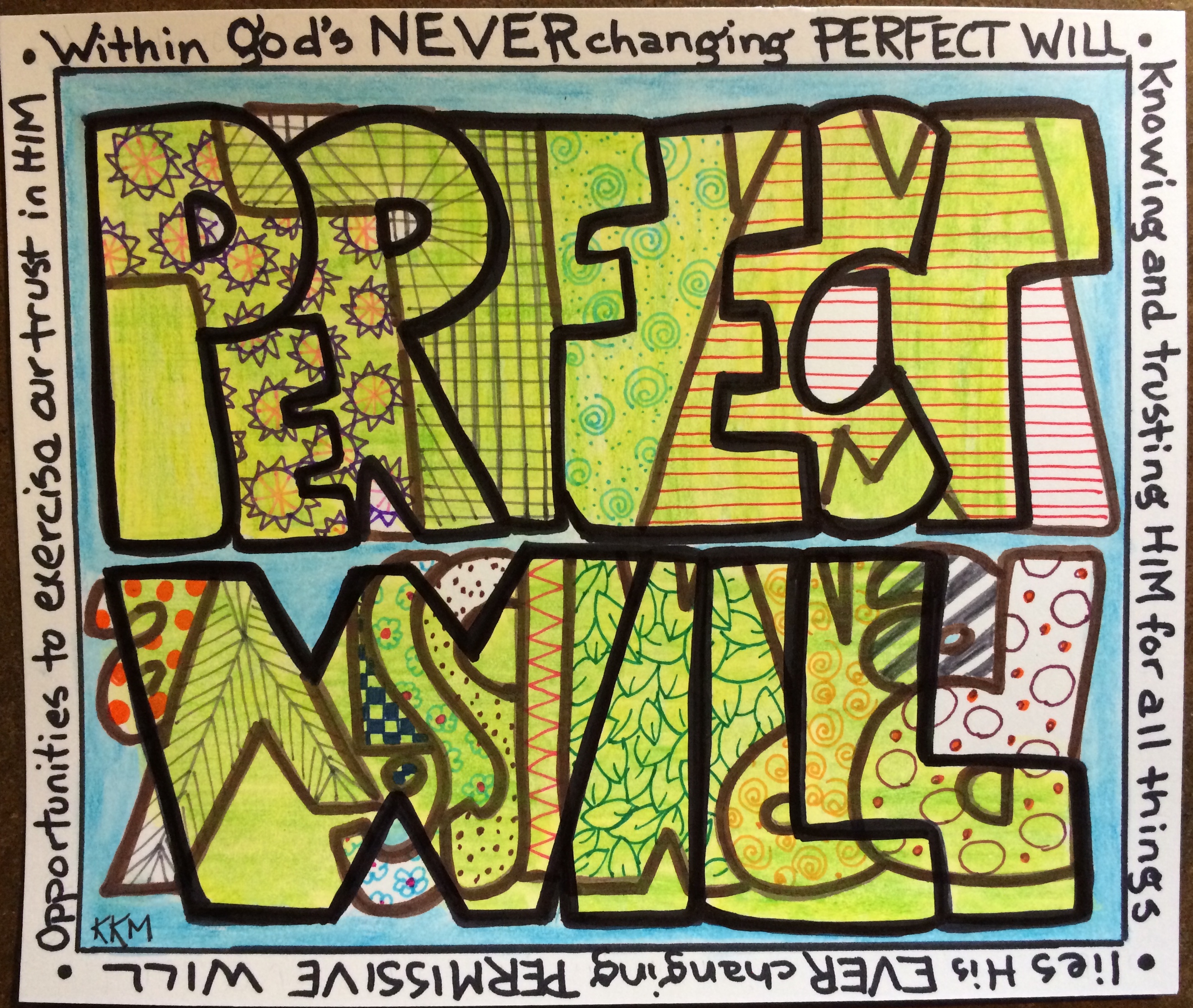 I struggled with how to depict God’s Perfect Will and His permissive will. They are so intertwined. So I intertwined them. The difference I have found with God’s perfect will and permissive will is, the constancy of His perfect will. Always the same shape and color….His will for us to know Him and trust Him IN ALL things and FOR ALL things never changes.